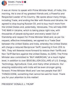特朗普:美印达成贸易协议 印度同意停购俄油+5000亿商品采购